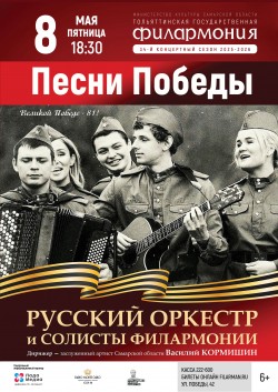 В филармонии состоится концерт, посвященный 81-й годовщине Великой Победы. В сопровождении Русского оркестра Тольяттинской филармонии под управлением заслуженного артиста Самарской области Василия Кормишина солисты исполнят ставшие летописью времени песни, прославляющие подвиг советских солдат и составляющие золотой фонд отечественной музыкальной культуры. Прозвучат марш С. Чернецкого «Будапешт» и вальс К. Молчанова из кинофильма «А зори здесь тихие», «Казаки» А. Бызова и «Легендарный вальс» В. Новикова, концертная пьеса «Катюша» для гармони с оркестром и «Вокализ Лизы Бричкиной» К. Молчанова из оперы «А зори здесь тихие» на балалайке и гитаре. Вокальные номера: «Ехал я из Берлина», «За того парня», «Вальс фронтовой медсестры», «Журавли», «На безымянной высоте», «Ты же выжил, солдат», «Давай закурим», «У полустанка», «Письмо из 45-го». Исполнители: М. Лебедев, Н. Брит, Л. Портынина, А. Одинцова, И. Супрунов, Р. Аббасов. Финальный аккорд – «День Победы» Д. Тухманова в исполнении всех солистов.